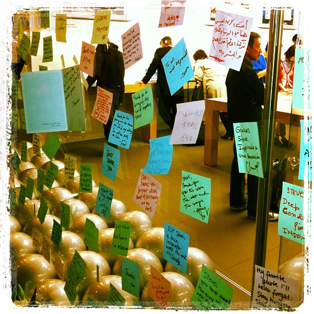 Spontaneous memorials are popping up at Apple Stores all over the world. This is one of the best and most artful pictures of this I've seen.